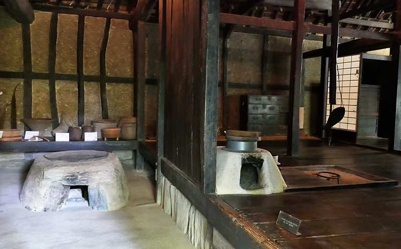 La pressa, nel mulino della famiglia Miyazaki (1865) ha tre macine di pietra. Le pietre venivano fatte girare da buoi, che camminavano in tondo. Sul muro si possono ancora vedere i segni lasciati dallo sfregamento sul muro del tronco a cui era legato il giogo (non mostrato).